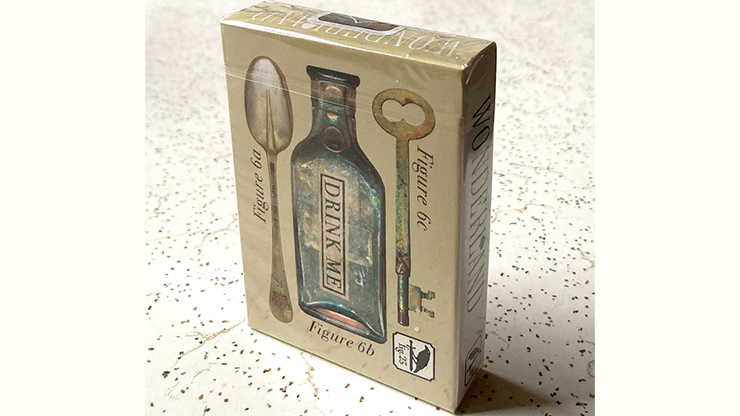 As part of the Fig. 23 brand, they feature flip-book style animation on the faces of each deck; "Wonderland" depicts Alice growing as a result of drinking from the "DRINK ME" bottle, and "Looking-Glass" depicts Alice reaching to Humpty Dumpty during his great fall. This deck not only showcases the original illustrations by Sir John Tenniel but also contains customized pips designed from those within such illustrations. The backsides are stylized collections of objects found within the books, such as a key, a spoon, chess pieces, and knitting needles.