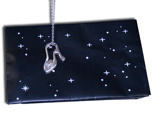 This is a magical silver slipper necklace. In the hands of the magician, the silver slipper is shown as strung on the necklace, gently shaking the chain the slipper falls from the necklace. The magician picks up the slipper and necklace and the slipper is tossed into an envelope and the chain is dipped inside. When the necklace is removed, the necklace has reattached itself back on the necklace.