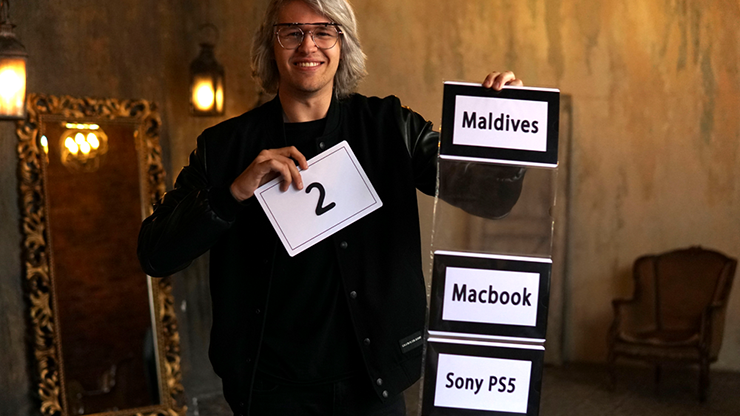 Luck/COVID-19 You ask a spectator to choose their future for the next year; you are showing 5 boards with five numbers on it. The spectator freely chooses any number from one to five. You show to the audiences that spectator's choice was the word "luck", but under all the other numbers there was... COVID-19