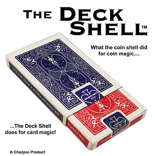 The Deck Shell What the coin shell did for coin magic....... the Deck Shell does for card magic! "Great idea!" John Cornelius "That's Incredible!" Jon Racherbaumer "It inspires the imagination." Michael Ammar "First time I've been fooled in years." Michael Close "Very clever. I see many applications." Stephen Minch "A revolutionary accessory for card magic!" Aldo Colombini Perform incredible feats of card magic with Chuck Leach's Deck Shell. One of the most unique card gaffs ever created, used by professionals and hobbyists. The Deck Shell makes the impossible, possible. The number of effects possible with the Deck Shell are endless. From close-up to stage, from comedy to mentalism, the Deck Shell can do it all with ease. One effect: A spectator selects and signs a red card from a red deck. The card is returned to the deck and the deck to its card box. A blue card box is brought out, and the blue deck is spread. All the cards are blue backed except one...which is red backed. This card is removed and turned over...it is the spectator's signed card! No sleights. The Deck Shell will allow you to switch decks without detection. The included DVD offers a wide range of effects, from stage mentalism to close-up miracles at the table. With the DVD you can jump right to the routine or sleights you wish to learn. Additional information is offered in the included print instructions. The Deck Shell is a metal shell with a real card box cover. They come in Bicycle red or blue backed, poker-size.