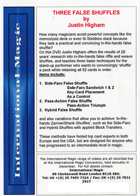 On this DVD Justin Higham offers the results of 20 years' research into in-the-hands false riffle and weave shuffles, and teaches three basic techniques for the stand-up performer who wants to convincingly 'shuffle' a pack while retaining all 52 cards in order. Items include: